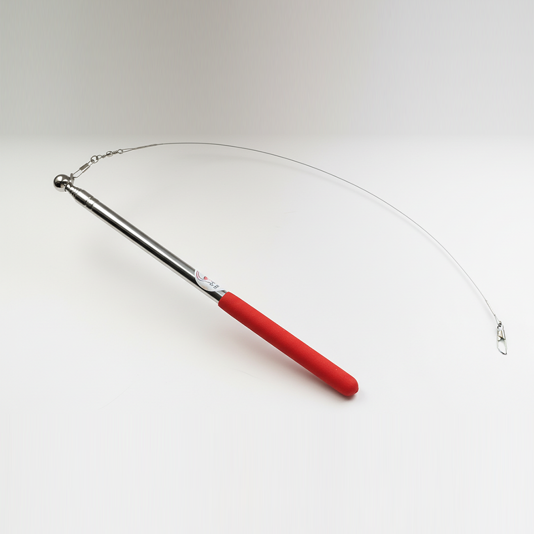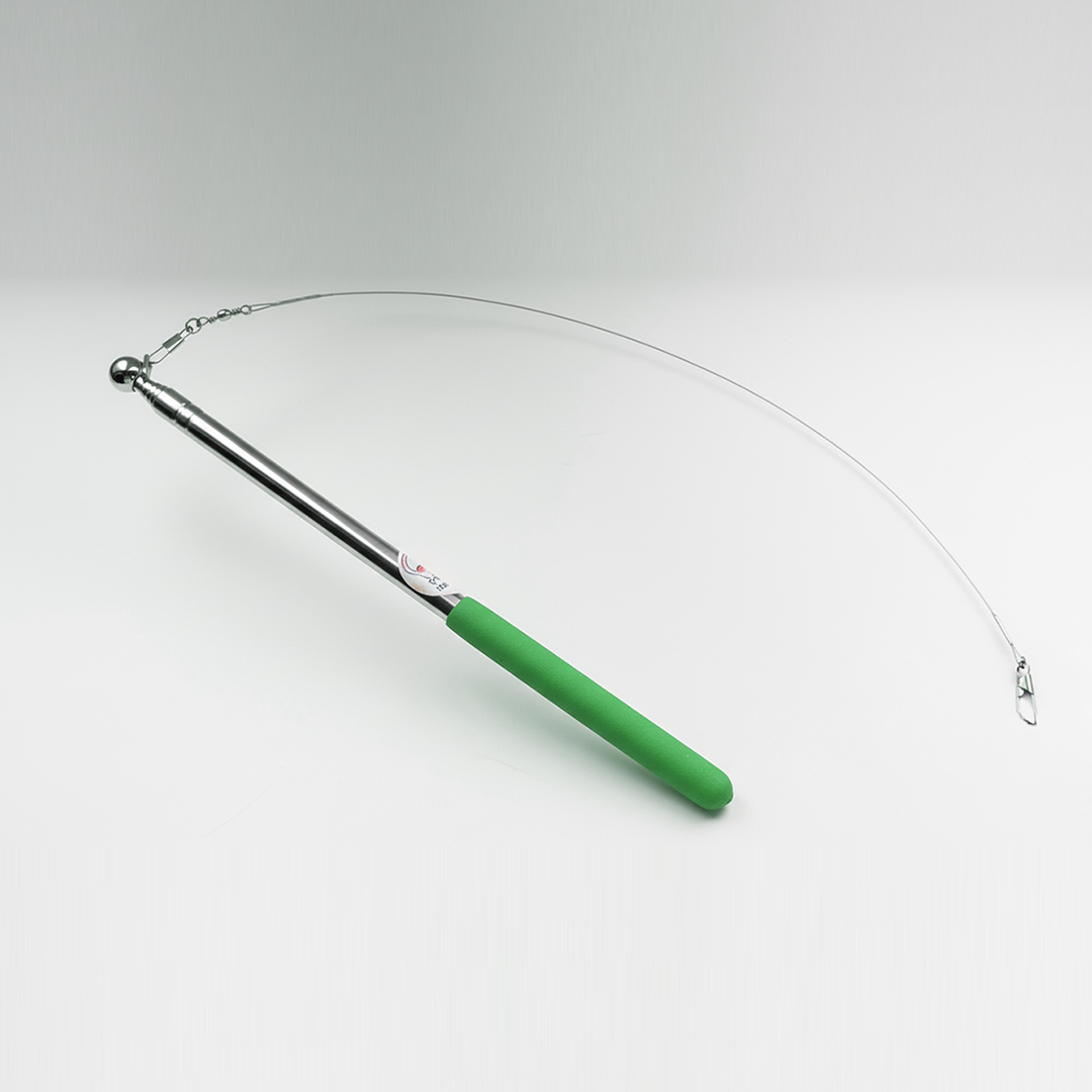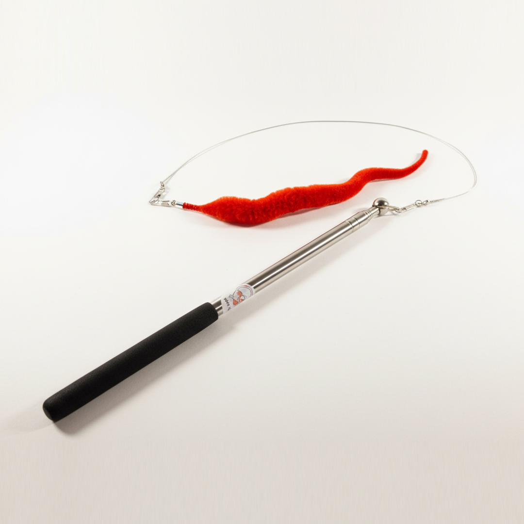 Wędka po rozłożeniu jest długa (ok. 1 m), dzięki czemu możesz zachować bezpieczny dystans między swoimi dłońmi a kocimi zębami i pazurami. Po złożeniu robi się kompaktowa – zmieści się do szuflady, szafki, a nawet do kociego pudełka z zabawkami.